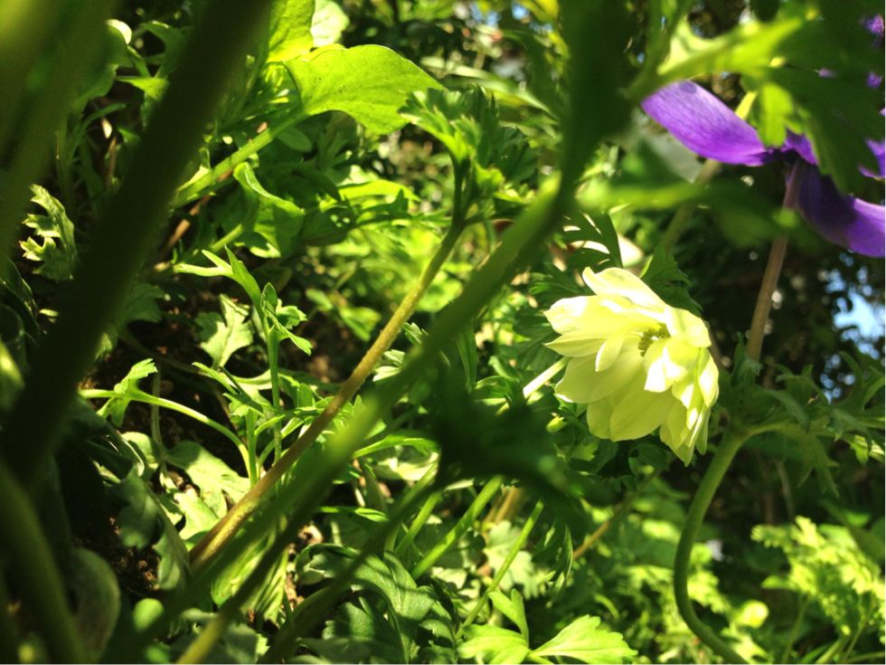 庭のアネモネ、小さい八重咲きのが咲いてたよー!うつむいてて困りものだけどかわいい!