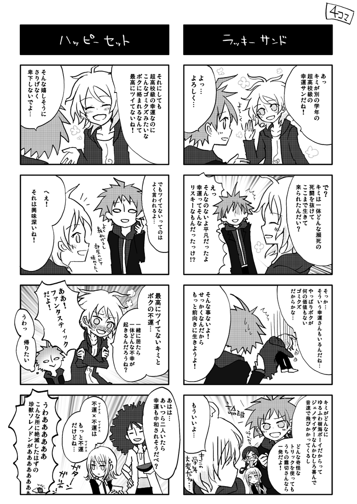 ダンガンロンパとスーパーダンガンロンパ2混合のオールキャラ、カラーイラスト+4コマ本です。B5の薄い本ですが何卒よろしくお願いします〜!