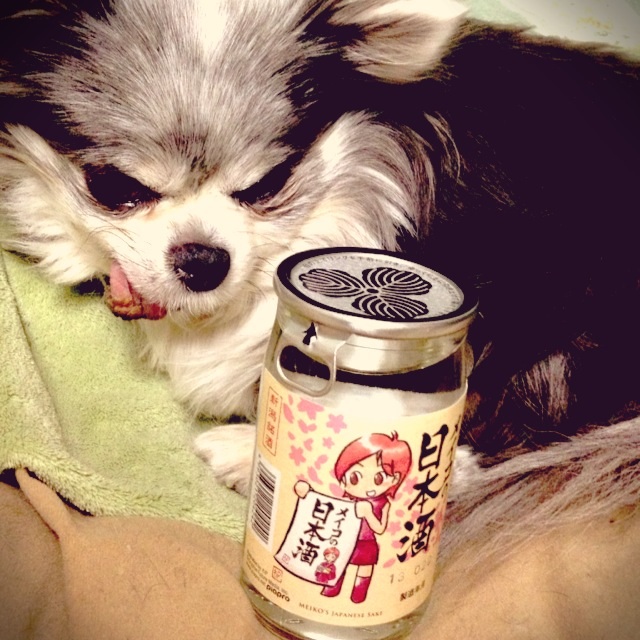 みゆきさんに送っていただいたMEIKO酒とうちの犬です。寝てた所に無理矢理置いたからすげー迷惑そう!